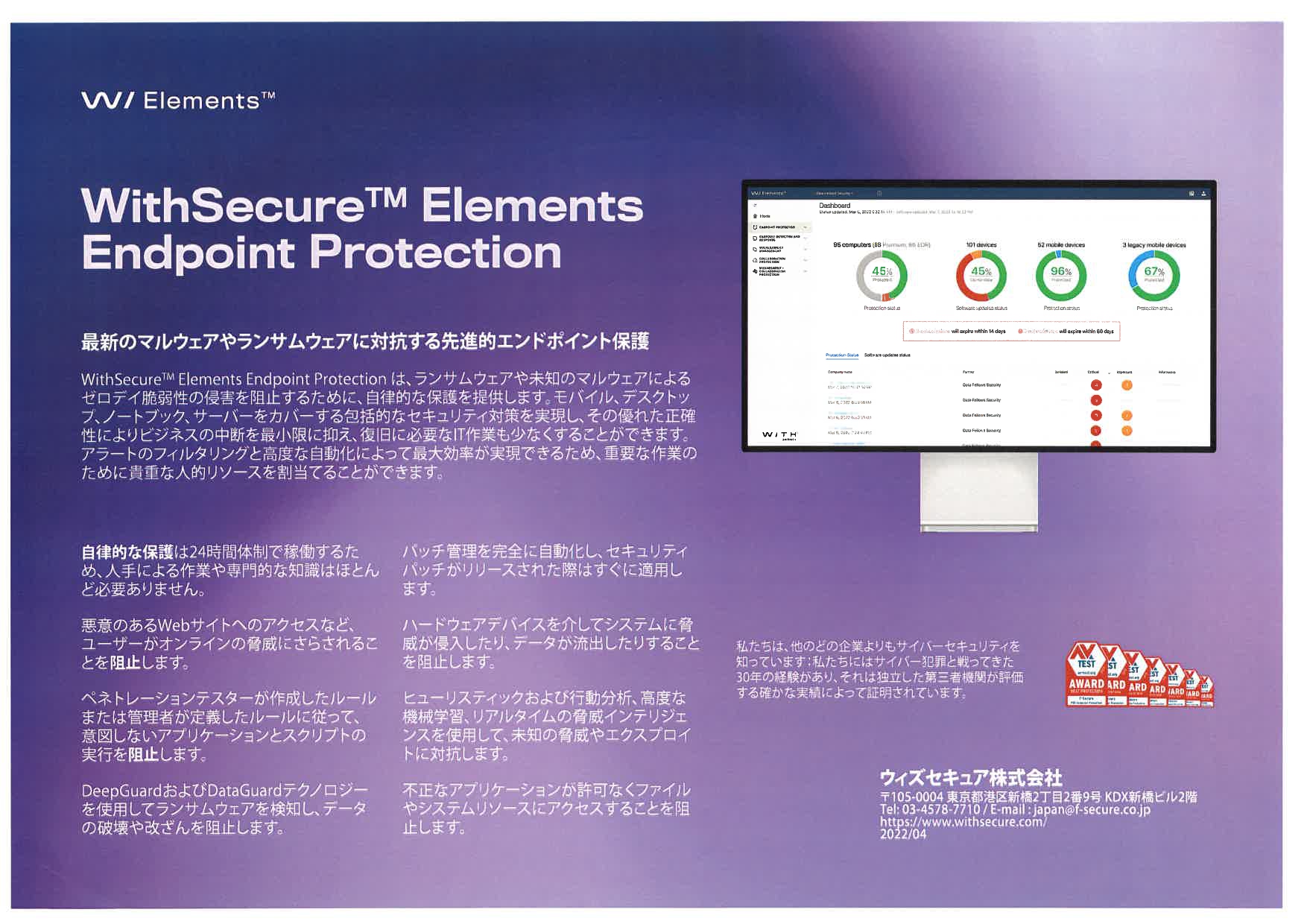 WithSecure™ Elements Endpoint Protection(EPP)は、クラウドベースで運用可能な次世代型セキュリティ製品です。